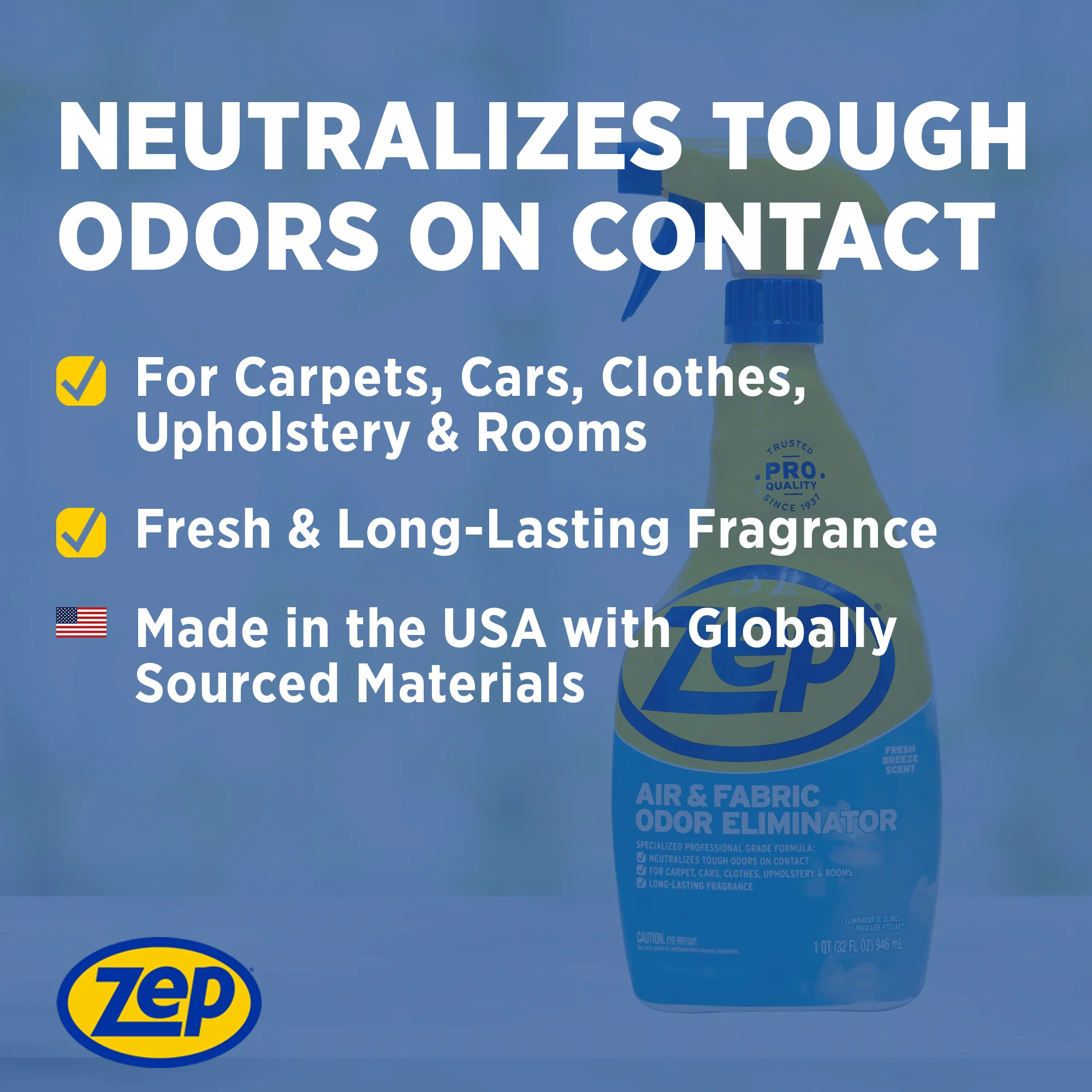 Zep Air & Fabric Odor Eliminator is a professional-grade deodorizer formulated to neutralize the toughest odors on contact. Ideal for use on carpets, upholstery, clothing, bedding, and rugs, as well as for freshening the air in any room, this versatile product ensures a fresh and pleasant atmosphere. With a long-lasting fresh breeze scent, it leaves your home, car, office, or business smelling clean and inviting. Whether you’re tackling pet odors, food smells, or other stubborn malodors, Zep Air & Fabric Odor Eliminator provides effective and reliable deodorizing.