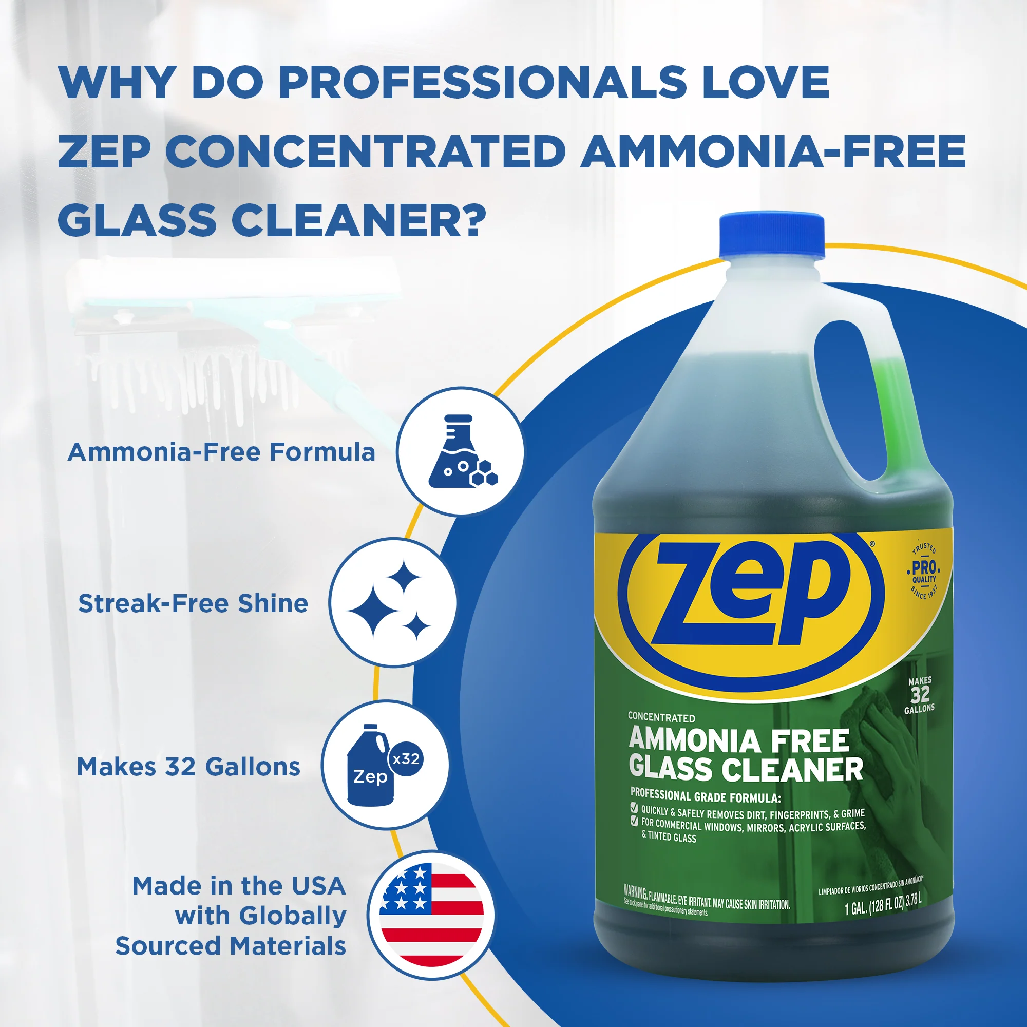 Zep Concentrated Ammonia-Free Glass Cleaner – Perfect for Commercial Windows - 1 Gallon