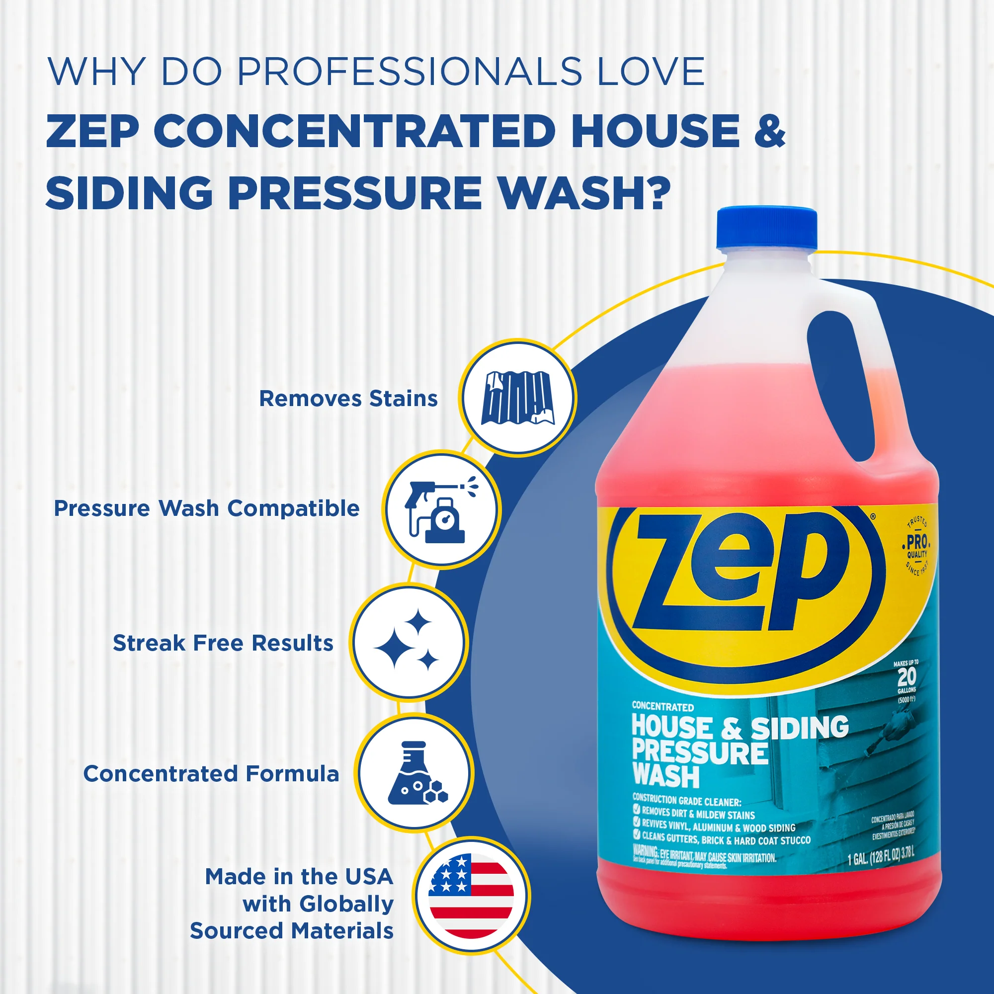 Zep House & Siding Pressure Wash Cleaner Concentrate is a powerful, construction-grade outdoor cleaner designed to eliminate stubborn dirt, mildew stains, and algae stains on a variety of exterior surfaces. This high-performance cleaner is great for reviving vinyl, aluminum, wood siding, and other materials such as hard coat stucco and brick, enhancing curb appeal by restoring a clean, fresh appearance. The concentrate creates up to 20 gallons of cleaning solution, making it an economical choice for large projects. This versatile formula is suitable for both manual application and pressure washing systems, ensuring thorough cleaning without scrubbing. With its pro-grade quality, Zep House & Siding Pressure Wash Cleaner Concentrate is an essential addition for any exterior cleaning routine.